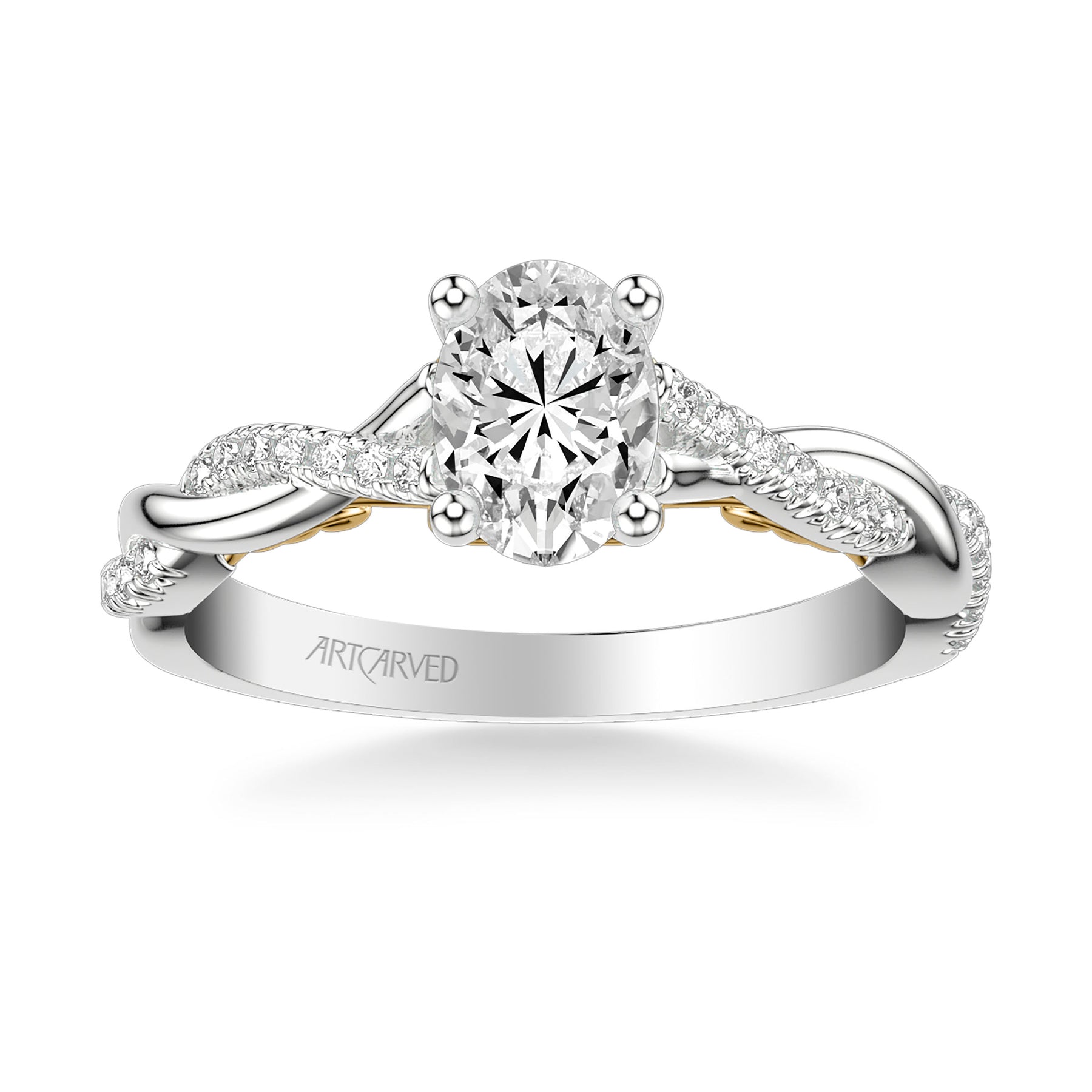 Lyric Engagement Ring with Carved Gallery details and Alternating Diamond and Polish Twist Shank