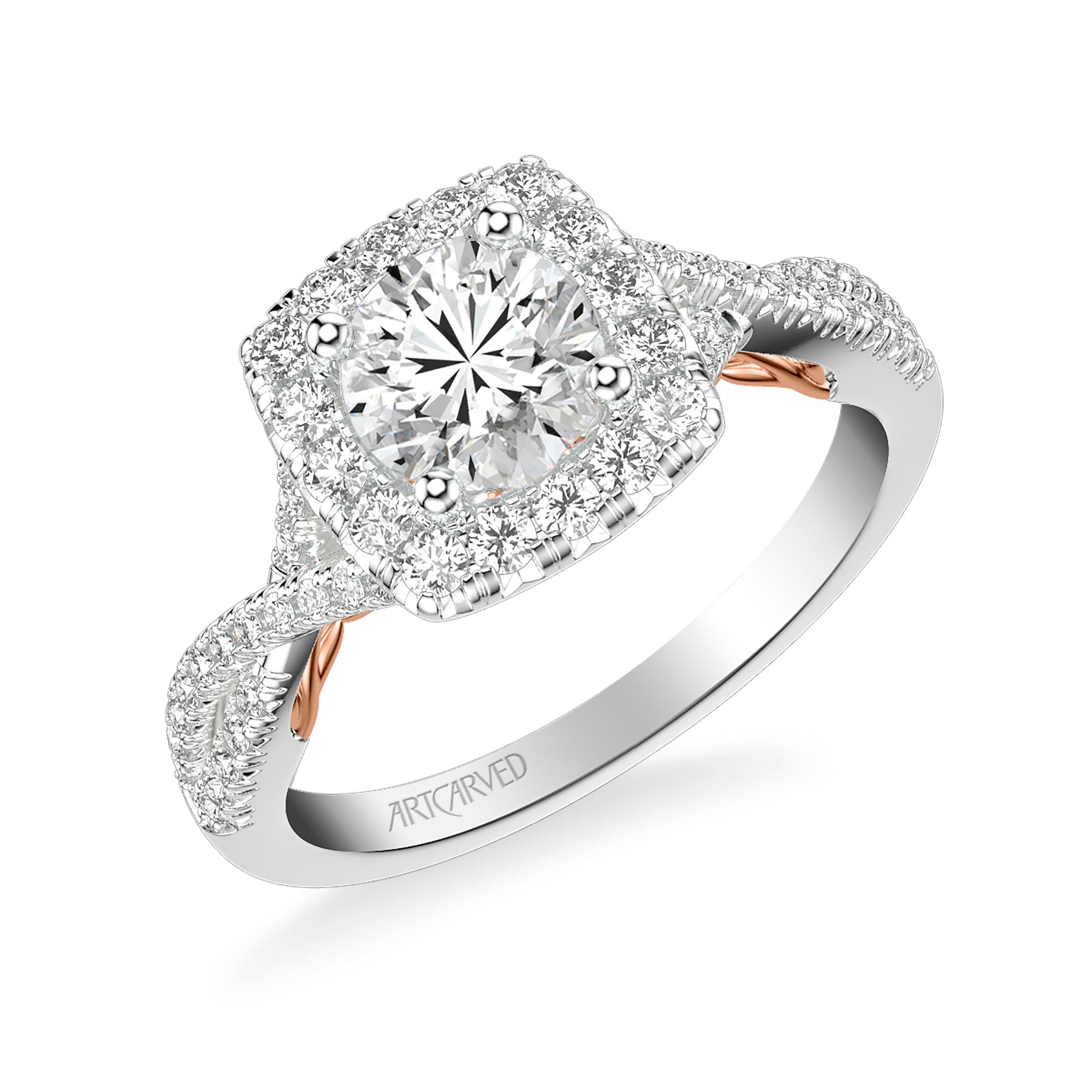 31-V1013ERWR-E.01 - ARTCARVED - Lyric Engagement Ring with Cushion Diamond Halo and Carved Gallery details with Twist Diamond Shank