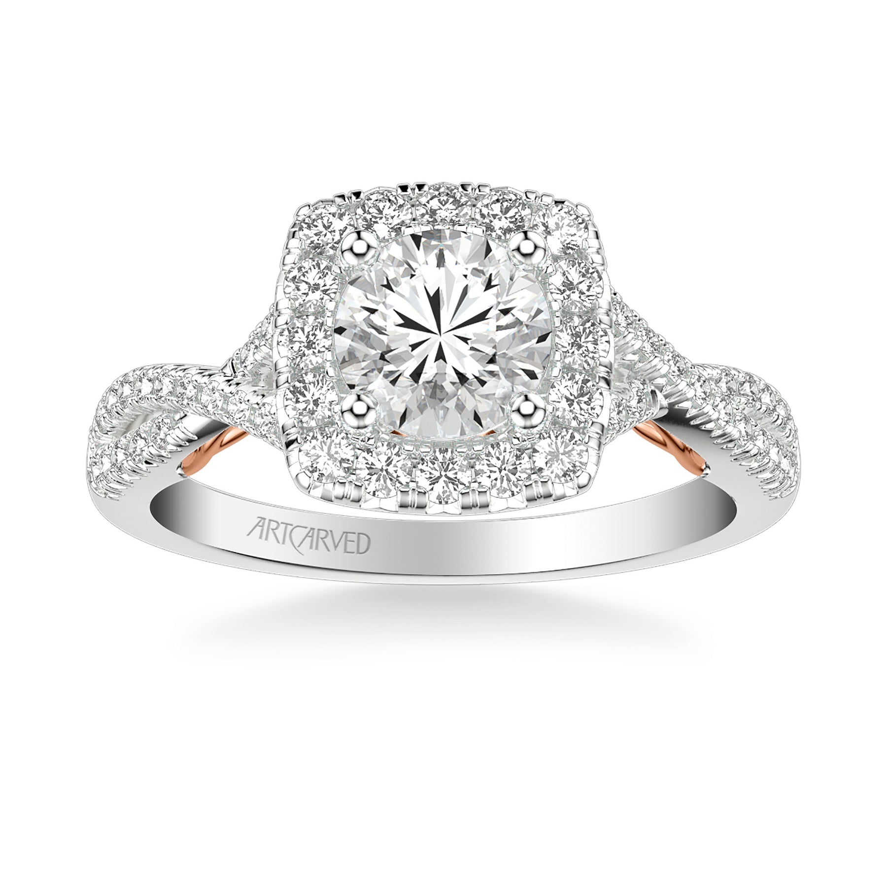 Lyric Engagement Ring with Cushion Diamond Halo and Carved Gallery details with Twist Diamond Shank