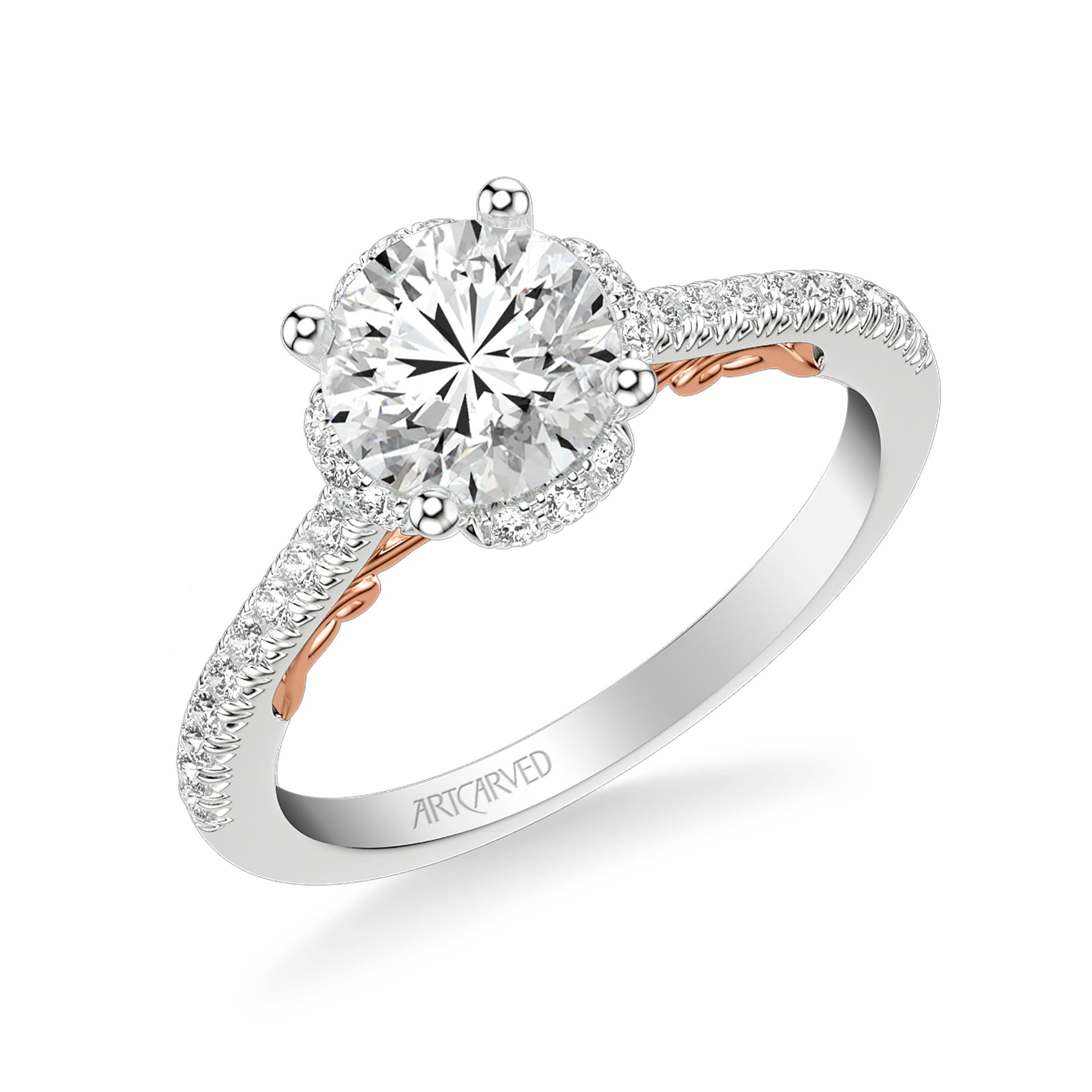31-V1010GRWR-E.01 - ARTCARVED - Lyric Engagement Ring with Round Diamond Halo and Carved Gallery details with Diamond Shank
