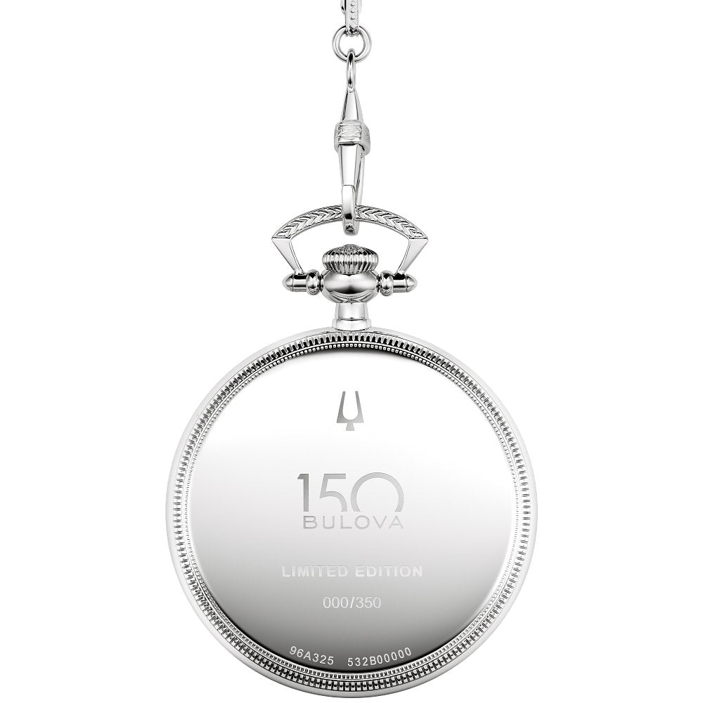 The Limited Edition Bulova Pocket Watch from the Archive Series takes inspiration from several Art Deco designs from the 1920s, celebrating the artistic craftsmanship that has long defined Bulova. The pocket watch features a coin-edge textured silver-tone stainless steel case with a textured bow and is finished with a sapphire crystal. The 15.8"" custom link chain was inspired by the original vintage pocket watch and is finished with a lobster claw and spring ring that was specially created for this timepiece. The stunning sterling silver dial reproduces the incredible work of early Bulova artisans with blue hands, intricately engraved central artwork, and dramatic numerals set against a brushed hour ring. The case back is etched with the 150th anniversary logo and is individually numbered to mark each limited-edition piece. In tribute to Bulova's history of ambitious watchmaking, the timepiece is powered by a self-winding Swiss mechanical movement with 21 jewels and a 62-hour power reserve. Commemorate Bulova's story and its place in American history with this exceptional pocket watch. Presented in a luxurious custom case complete with a storybook honoring our Art Deco heritage. Limited to 300 pieces worldwide.