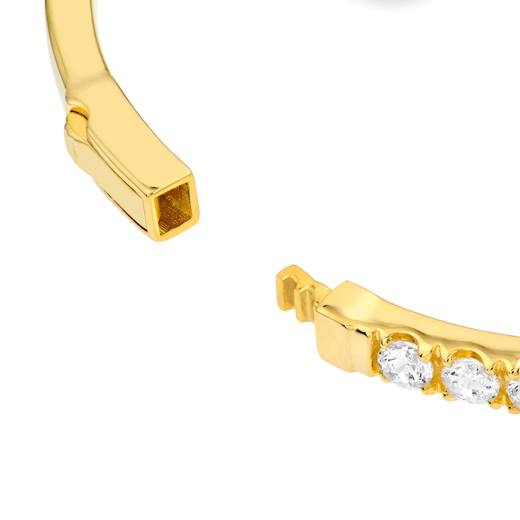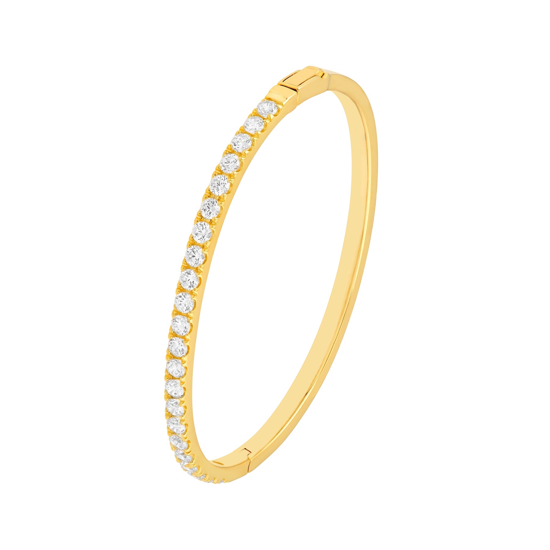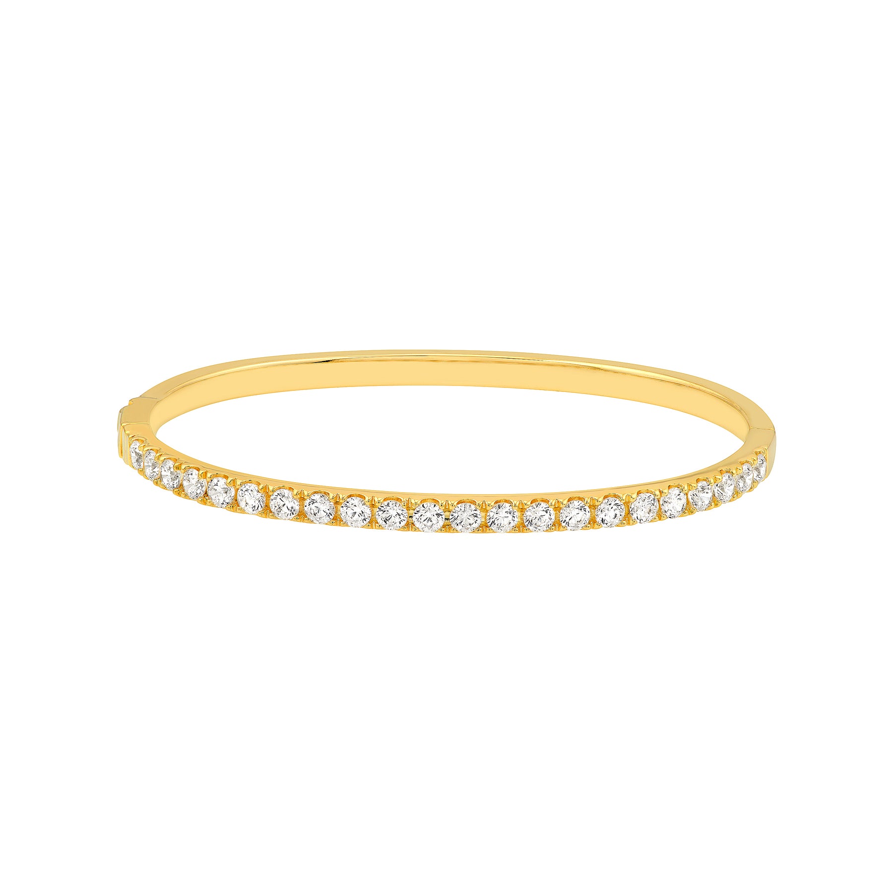 Chic, trendy, and statement worthy–enhace your stack with diamonds This 14K gold bangle is made with 2-5/8tcw diamonds and securs with a box lock.