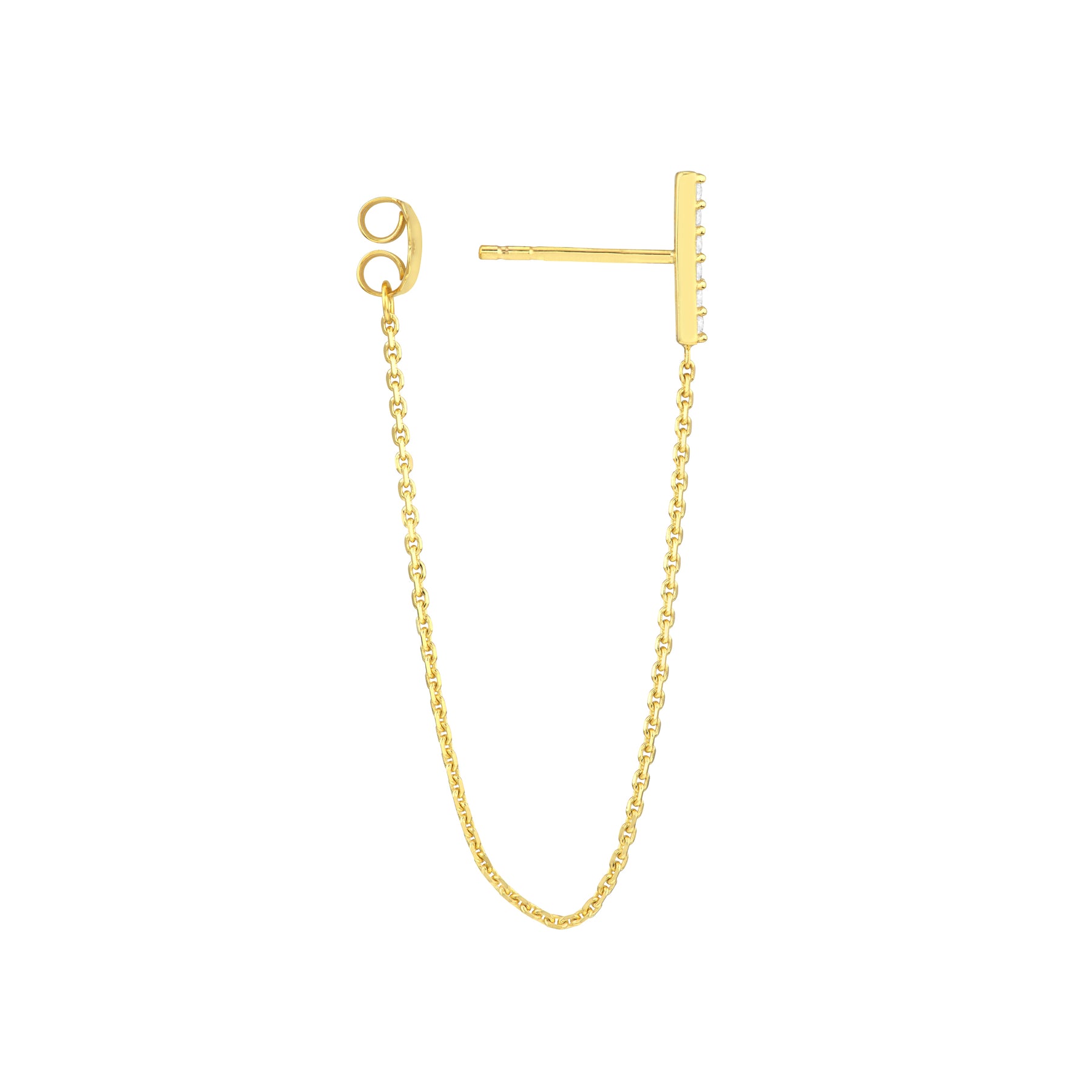 Rock front to back earrings to make your look fashion-forward. These 14K gold CZ staple bar front to back earrings add drama to every outfit.