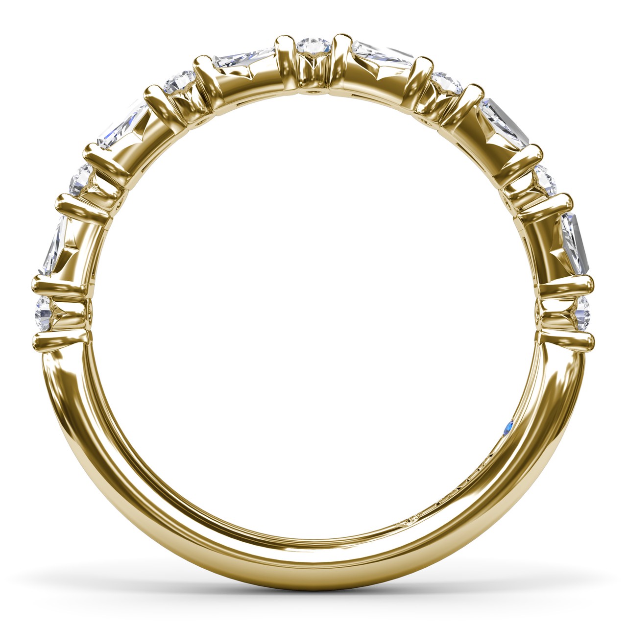 This diamond anniversary band features a modern design with alternating tapered and round diamonds. This band can be special ordered in any finger size, in Platinum, 18KT, or 14KT gold.