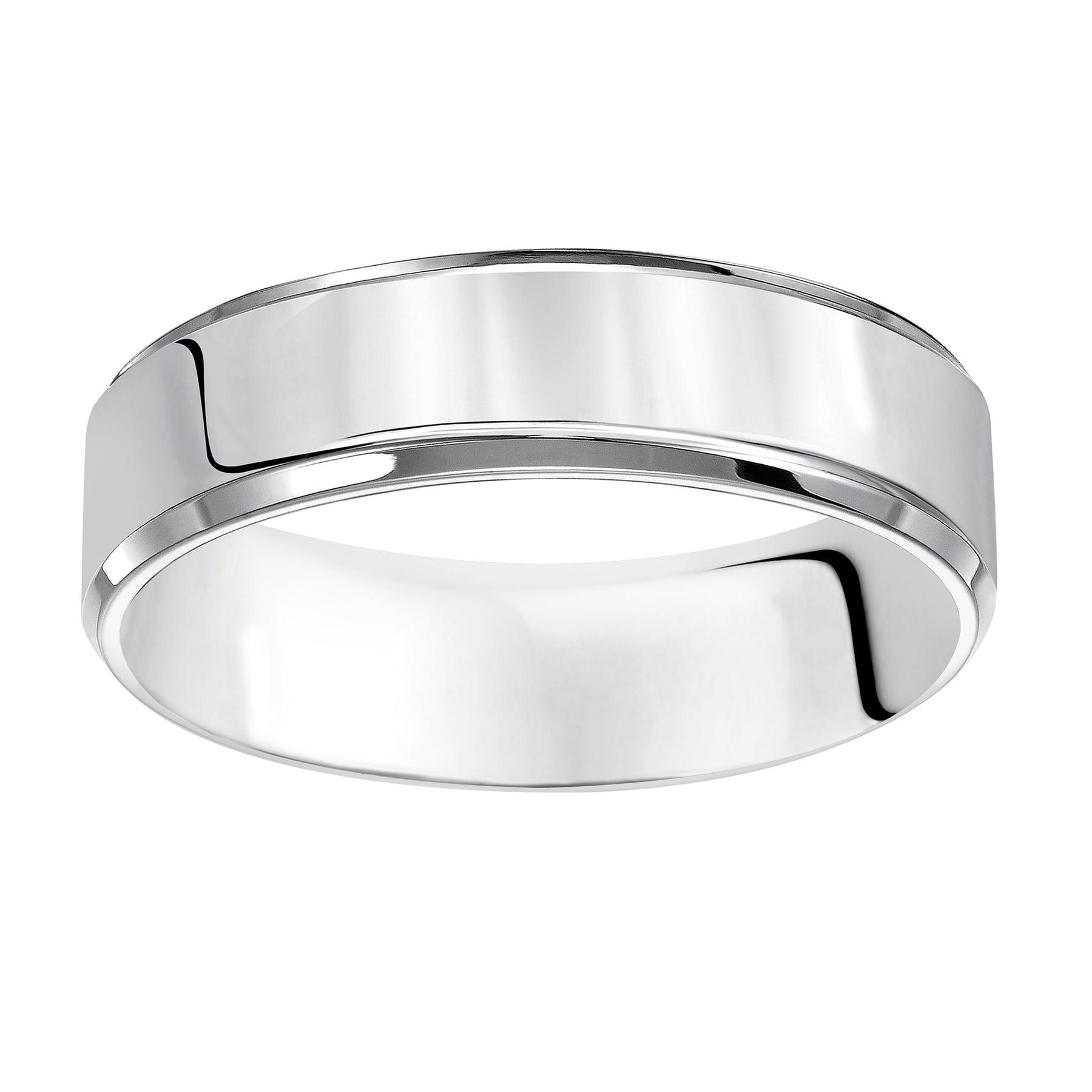 This Comfort Fit, wedding band is crisp and contemporary featuring a high polished beveled edge design