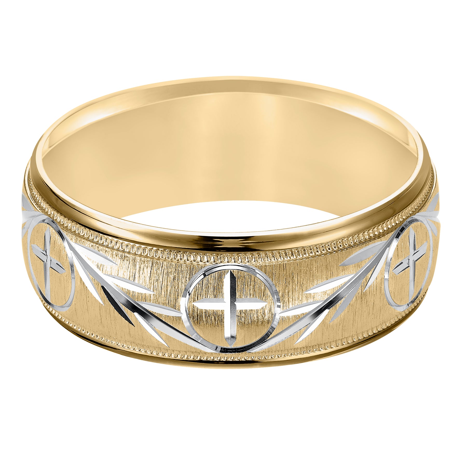 This finely crafted, two-tone gold, wedding band features an exquisite design, satin finish with milgrain and round edges