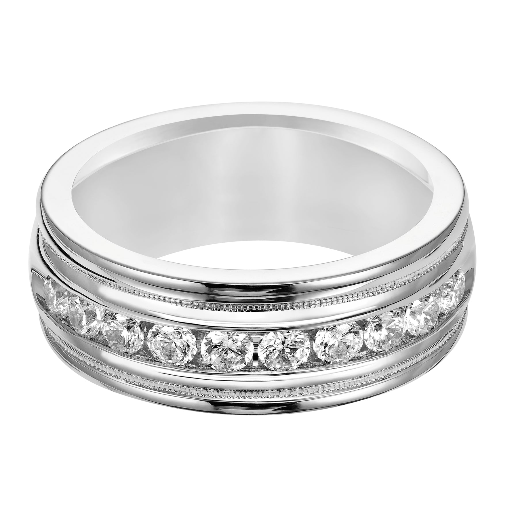 Traditional milgrain paired with a modern, bright finish, round edges and 10 stone channel set diamonds are the perfect combination for this exquisite, Comfort Fit, wedding band