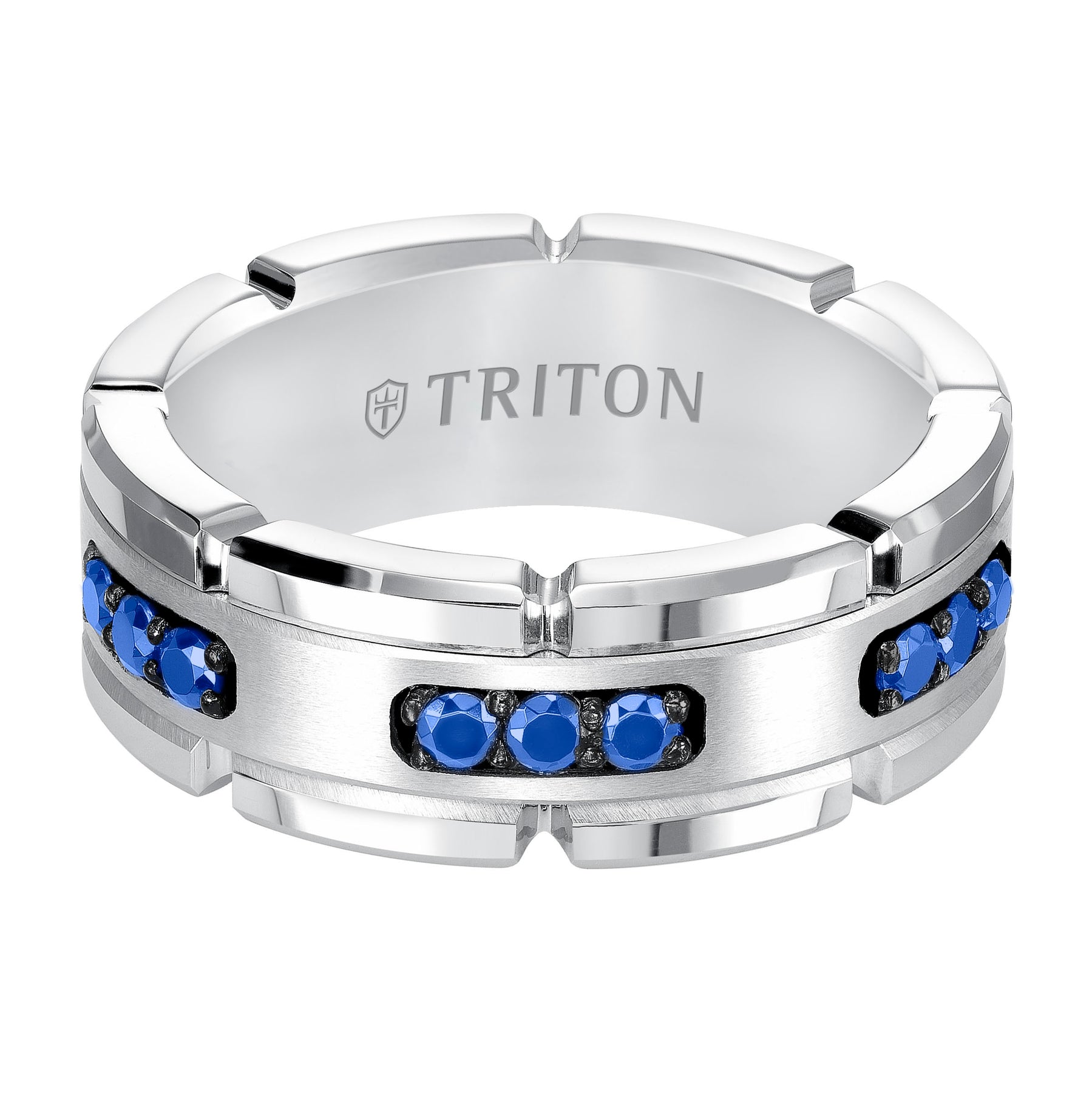 8mm White Tungsten Carbide Ring with Blue Sapphire Satin Center and Link Edge