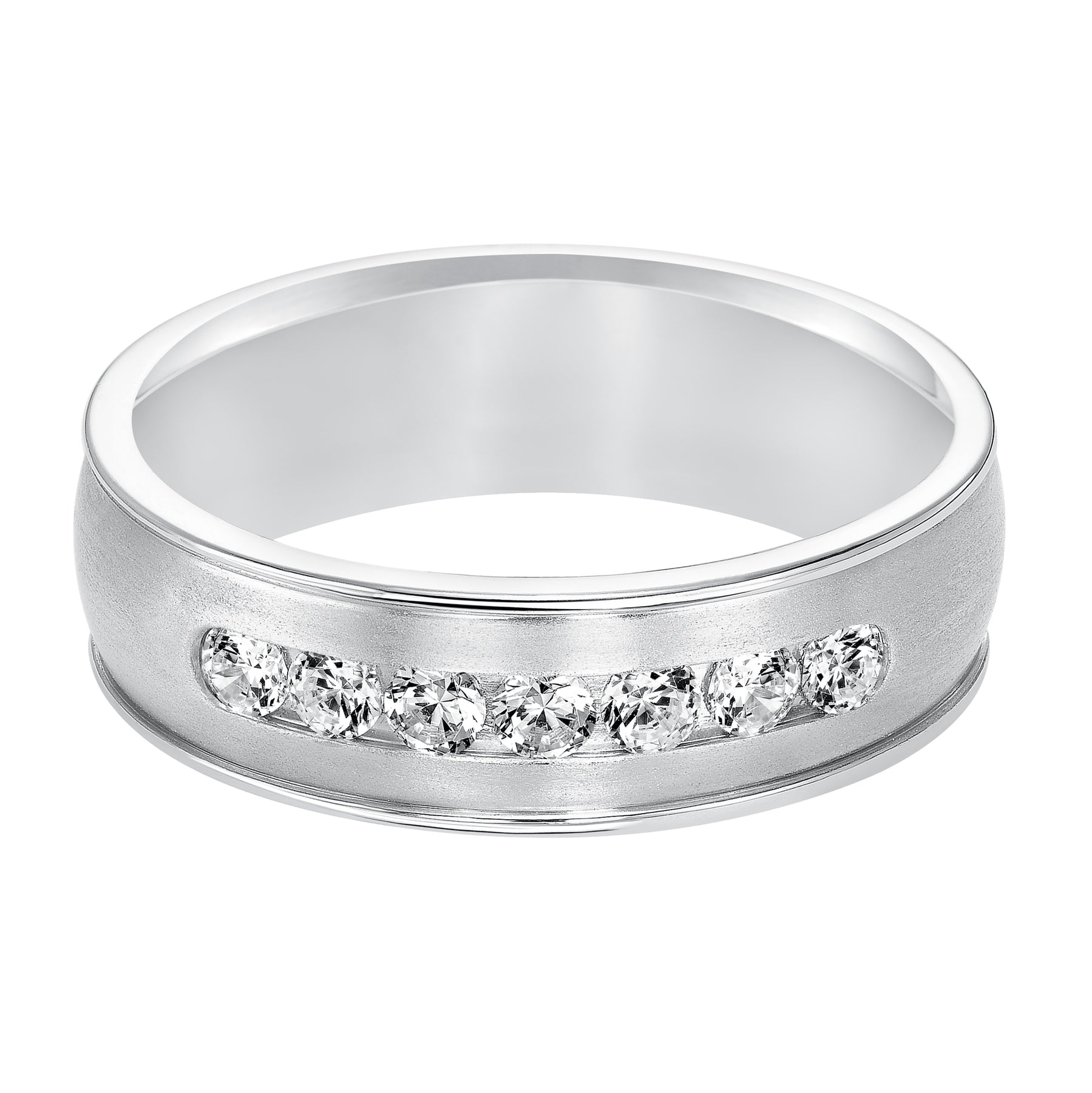 Distinct yet timeless, this low-domed, Comfort Fit, 7 stone diamond wedding band features satin finish with round edges