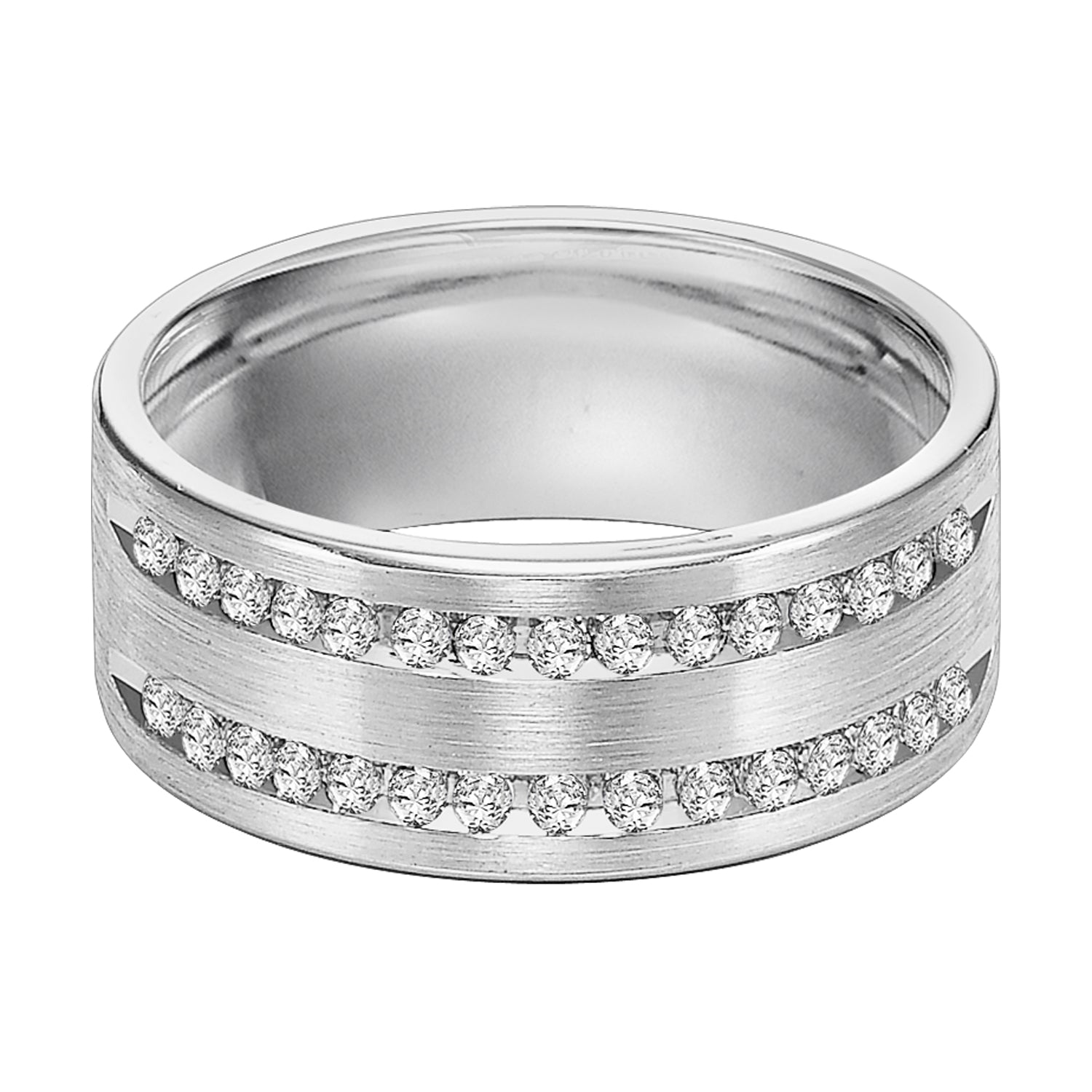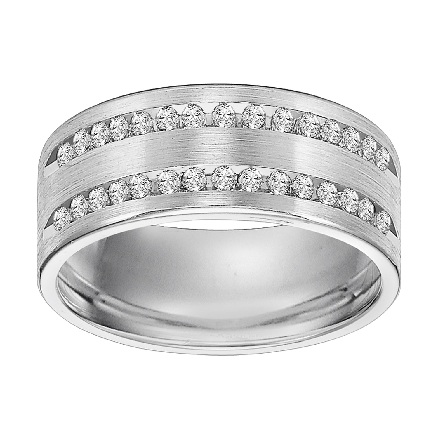 This 2 row, 30 stone diamond wedding band is Comfort Fit and features a satin finish and rolled edges for a grand look sure to make a statement