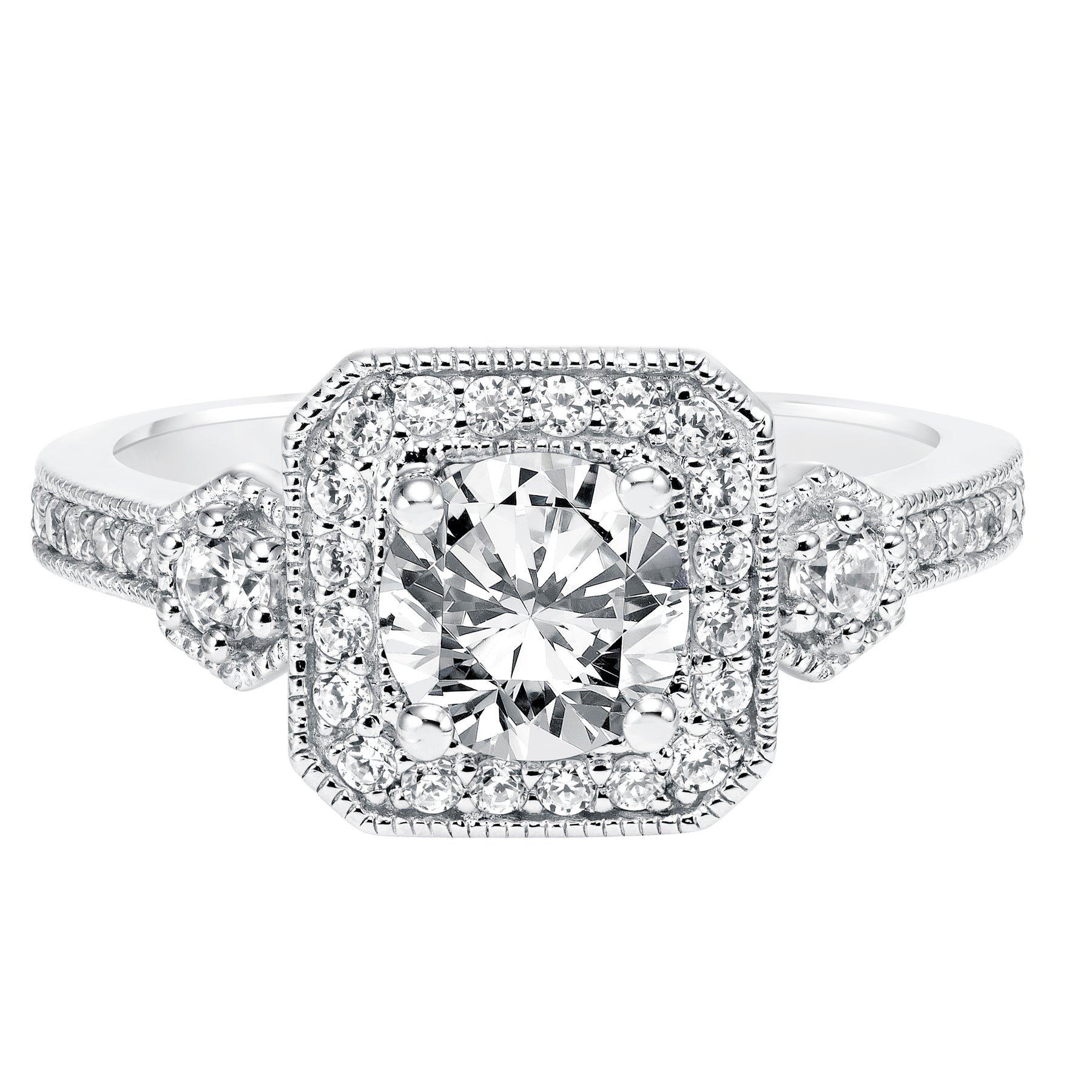 Three Stone Diamond Halo Engagement Ring with Diamond Shank and Milgrain Detail