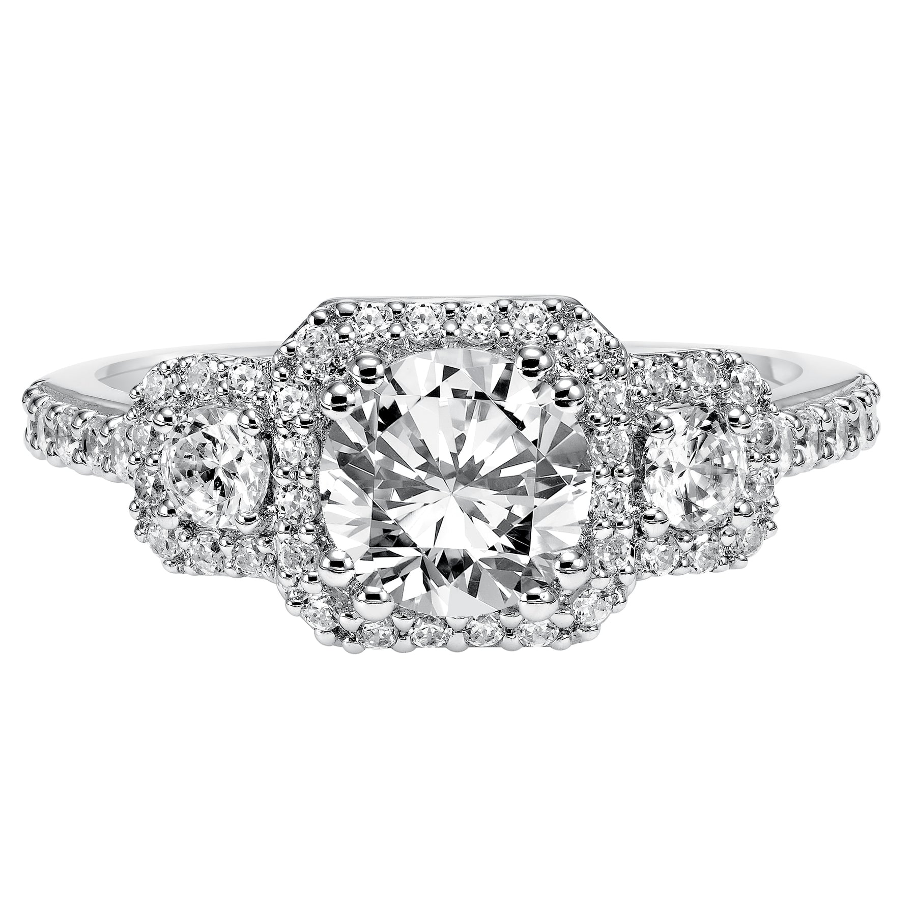 3-stone diamond engagement ring features prong set diamond halos surrounding each diamond whilst paired with a matching diamond band