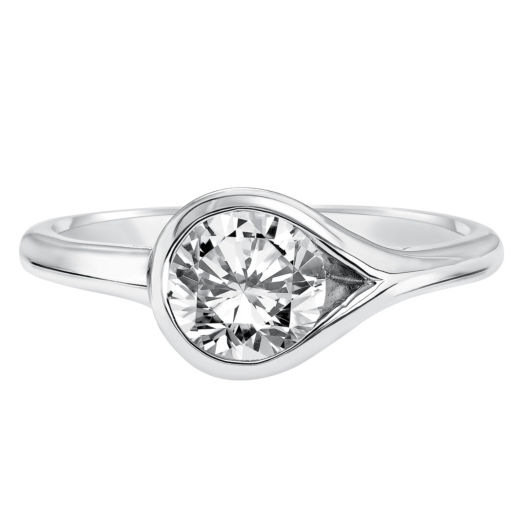 Chic and modern, this engagement ring is set beautifully in a high polished bezel set and bypass designed band