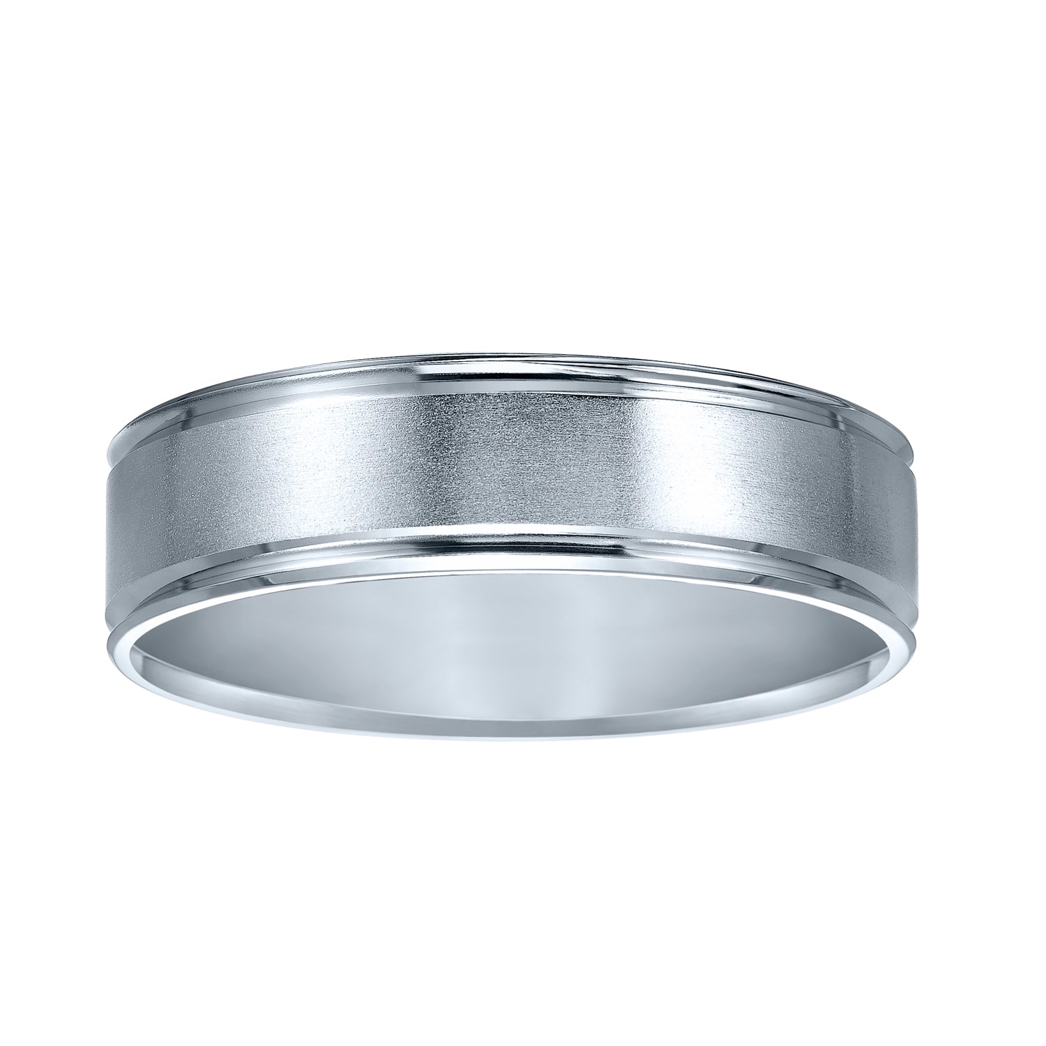 Comfort fit wedding band with brushed finish and beveled edges.