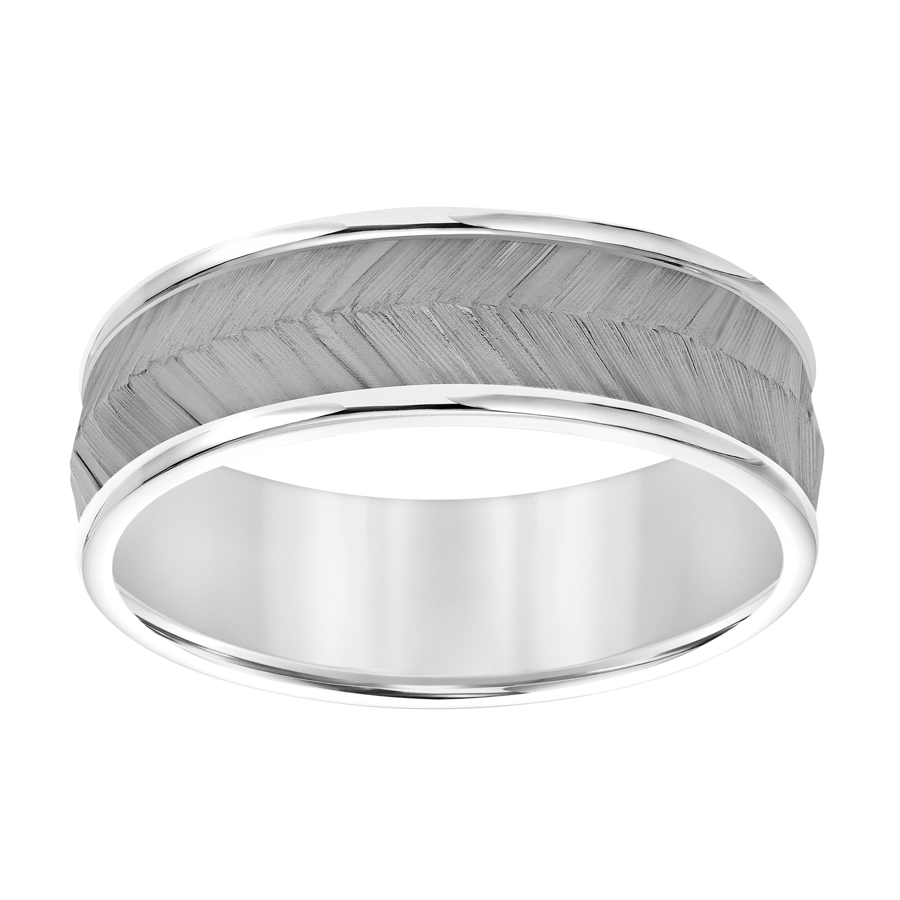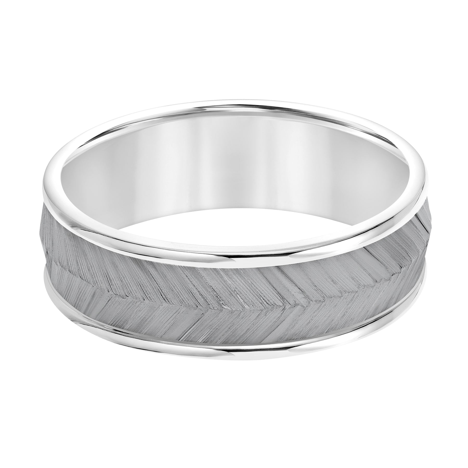 Men's Band with Black Rodium Center with Chevron Texture and Bright Round Edge