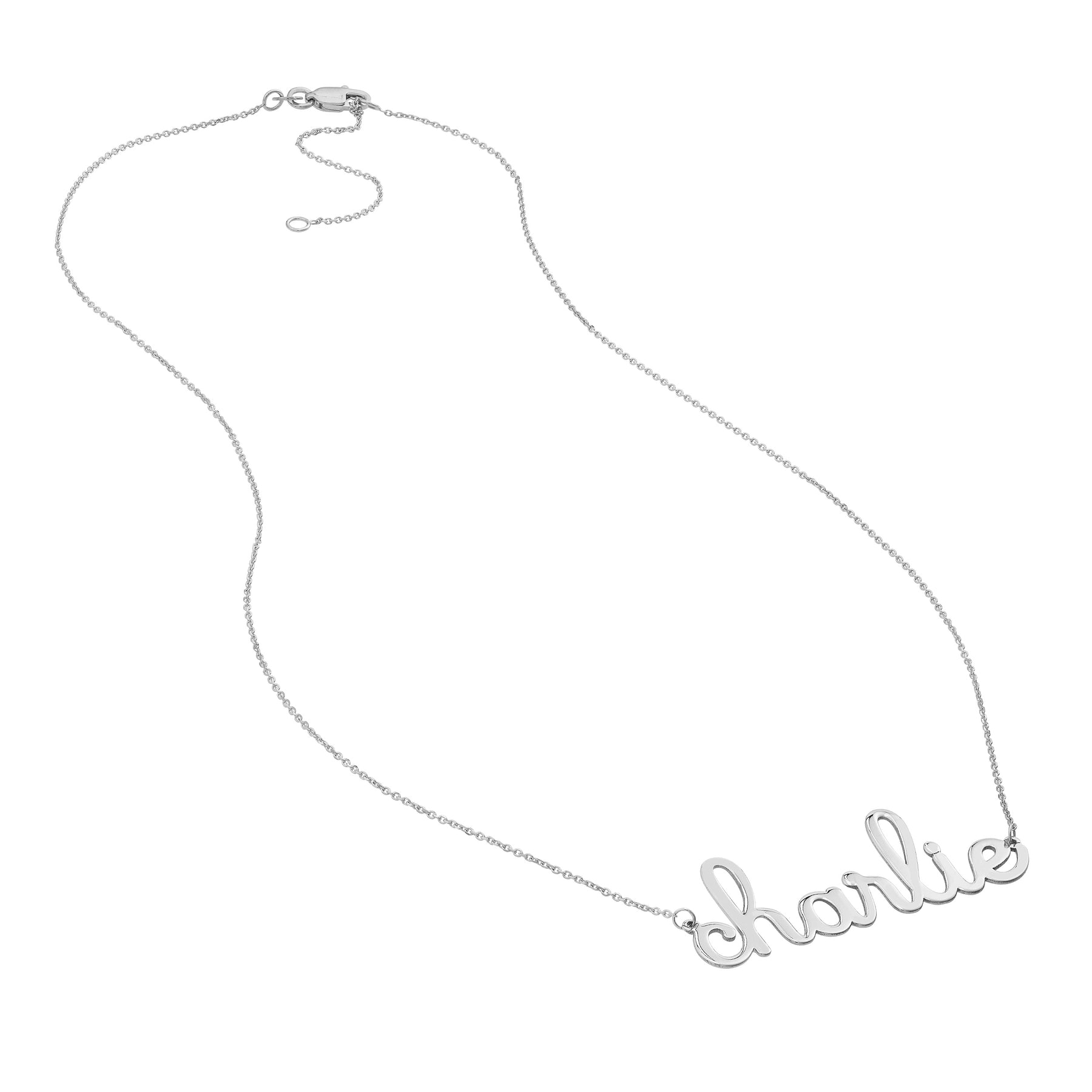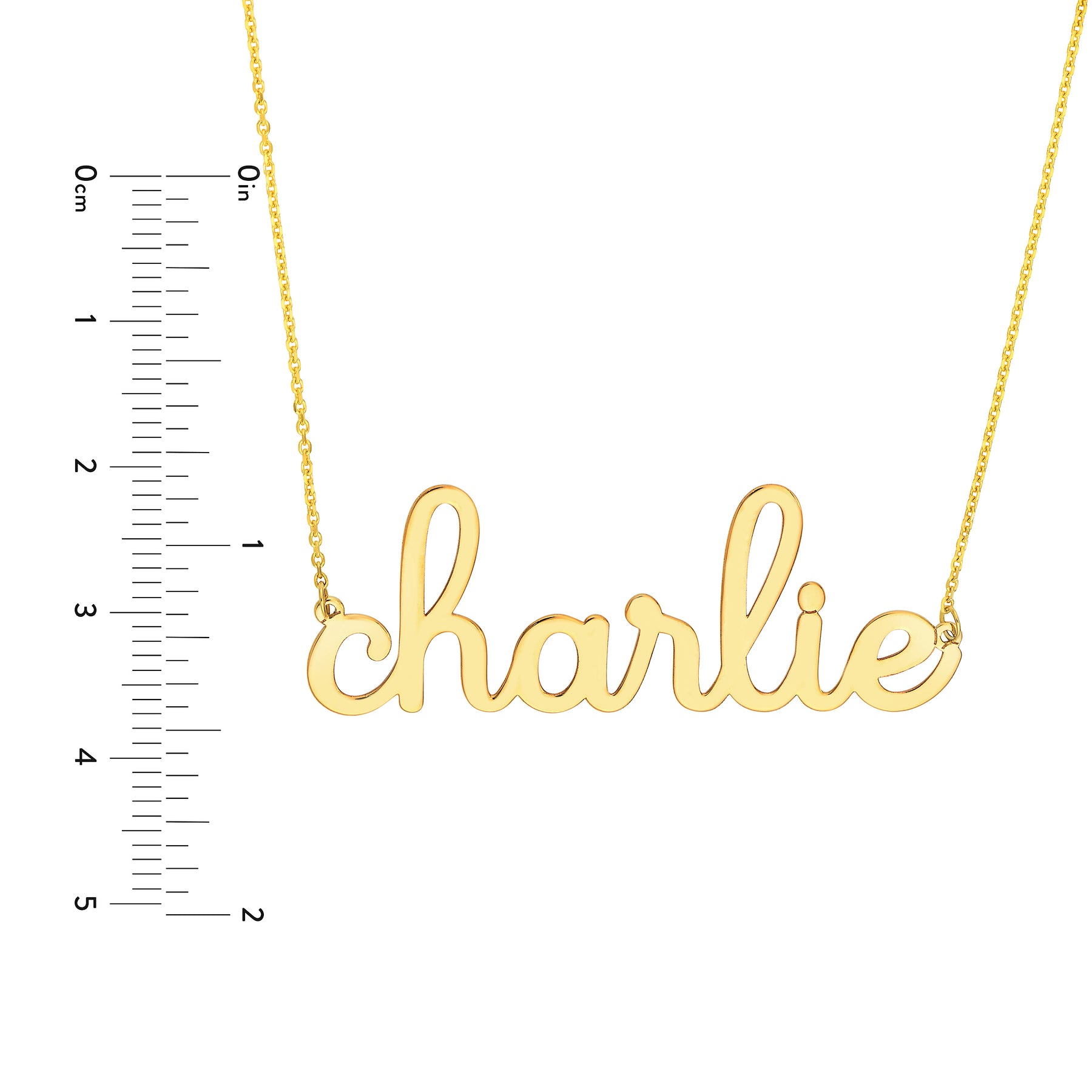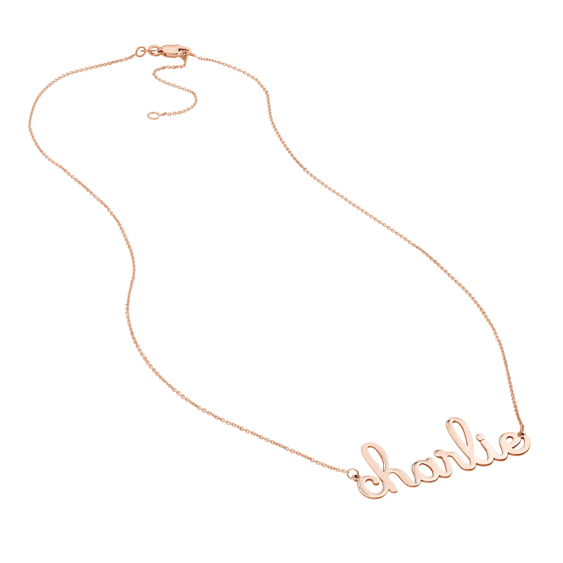 Feeling whimsical? Create a custom piece with this playful, doodle font nameplate necklace. Crafted in 14K yellow, white or rose gold.
