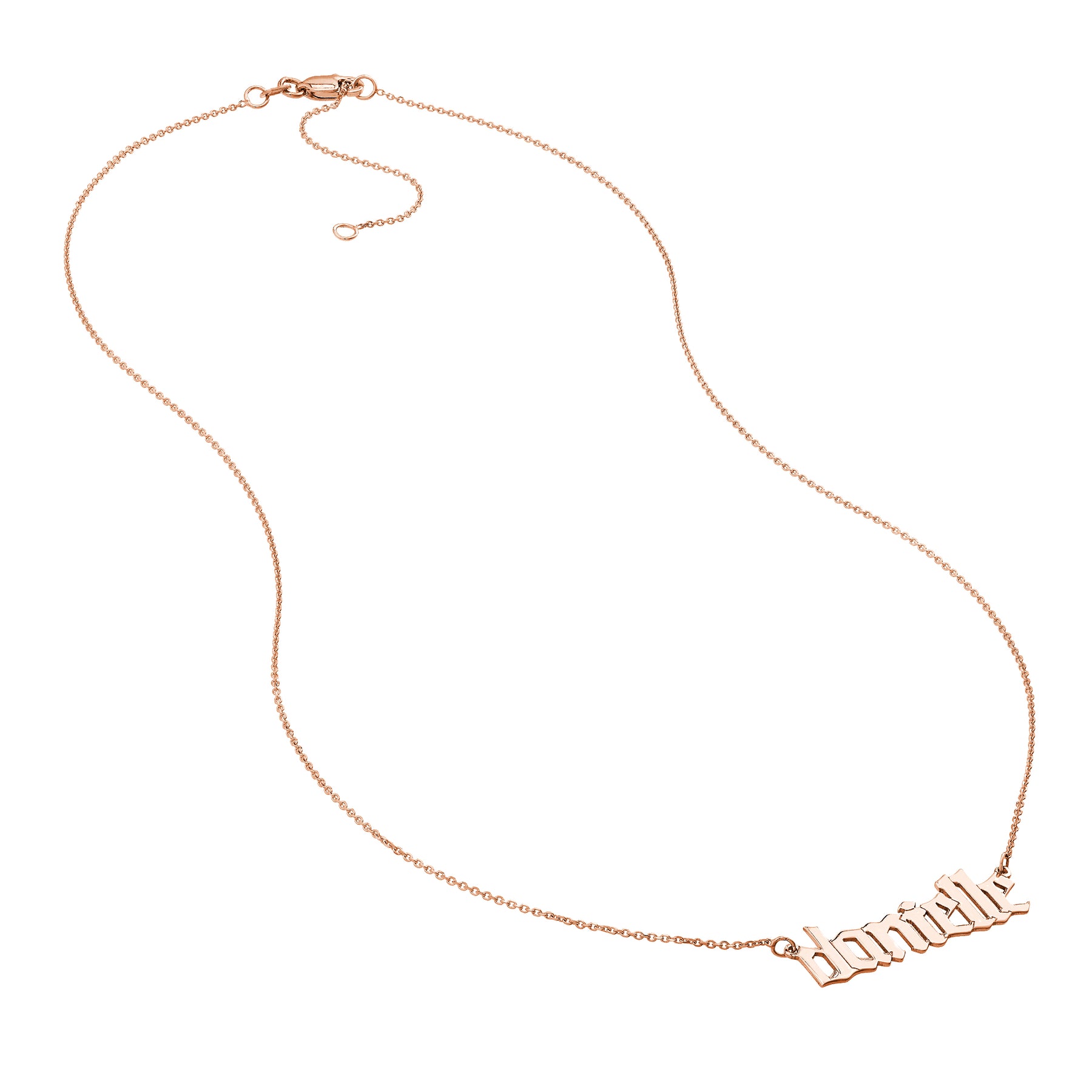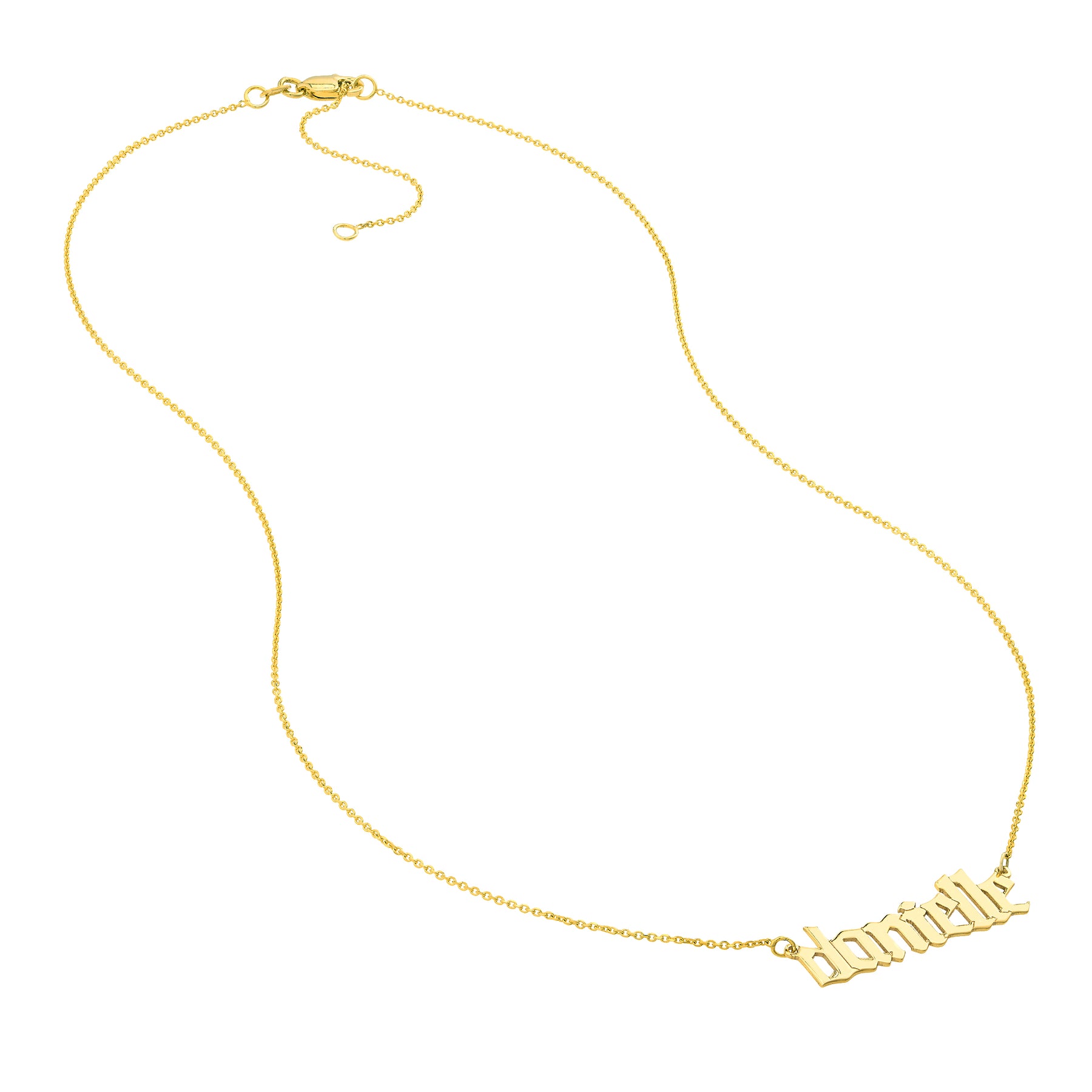 Identify in gold. Let your name shine bright and your style elevate higher. This 7mm Gothic Nameplate Necklace is adjustable from 16 to 18 inches. Made in 14K gold.