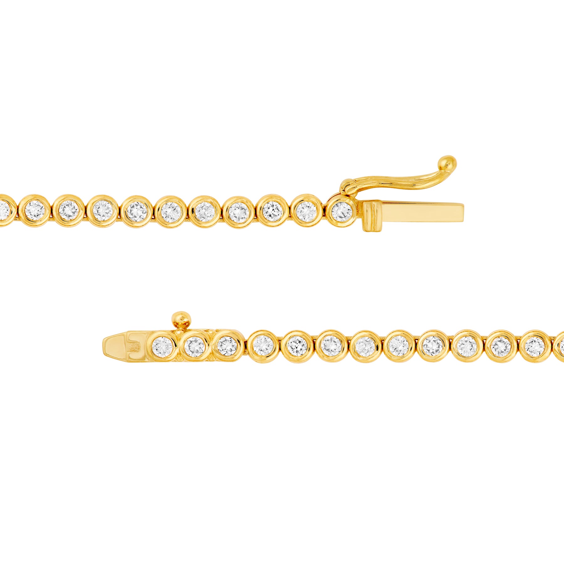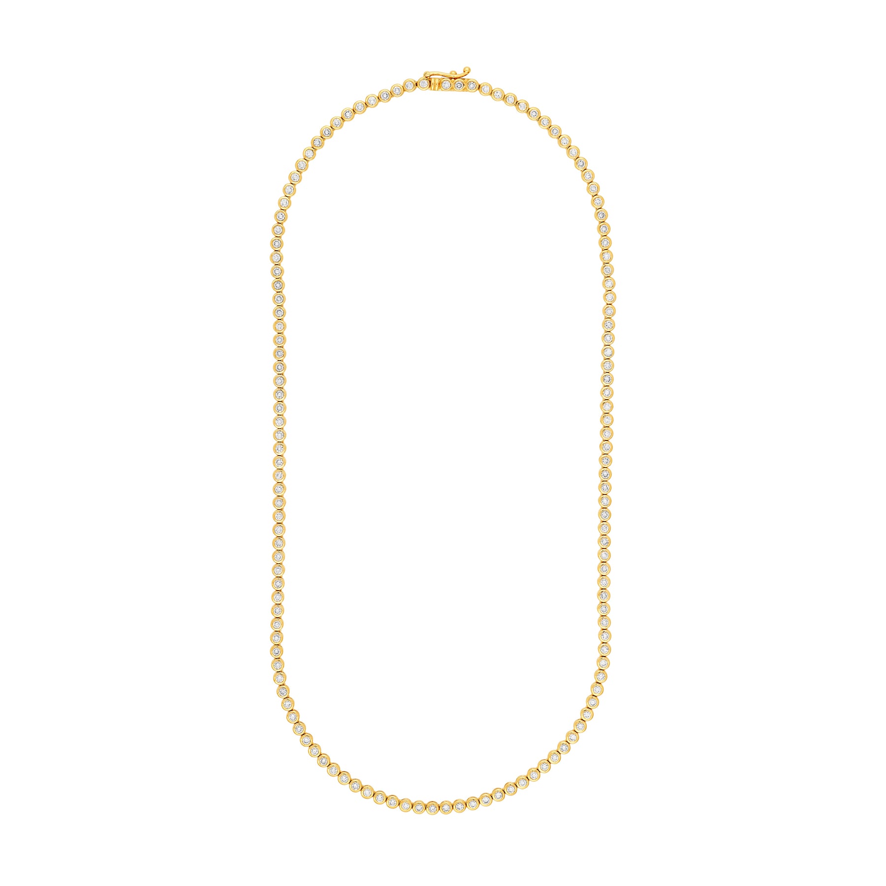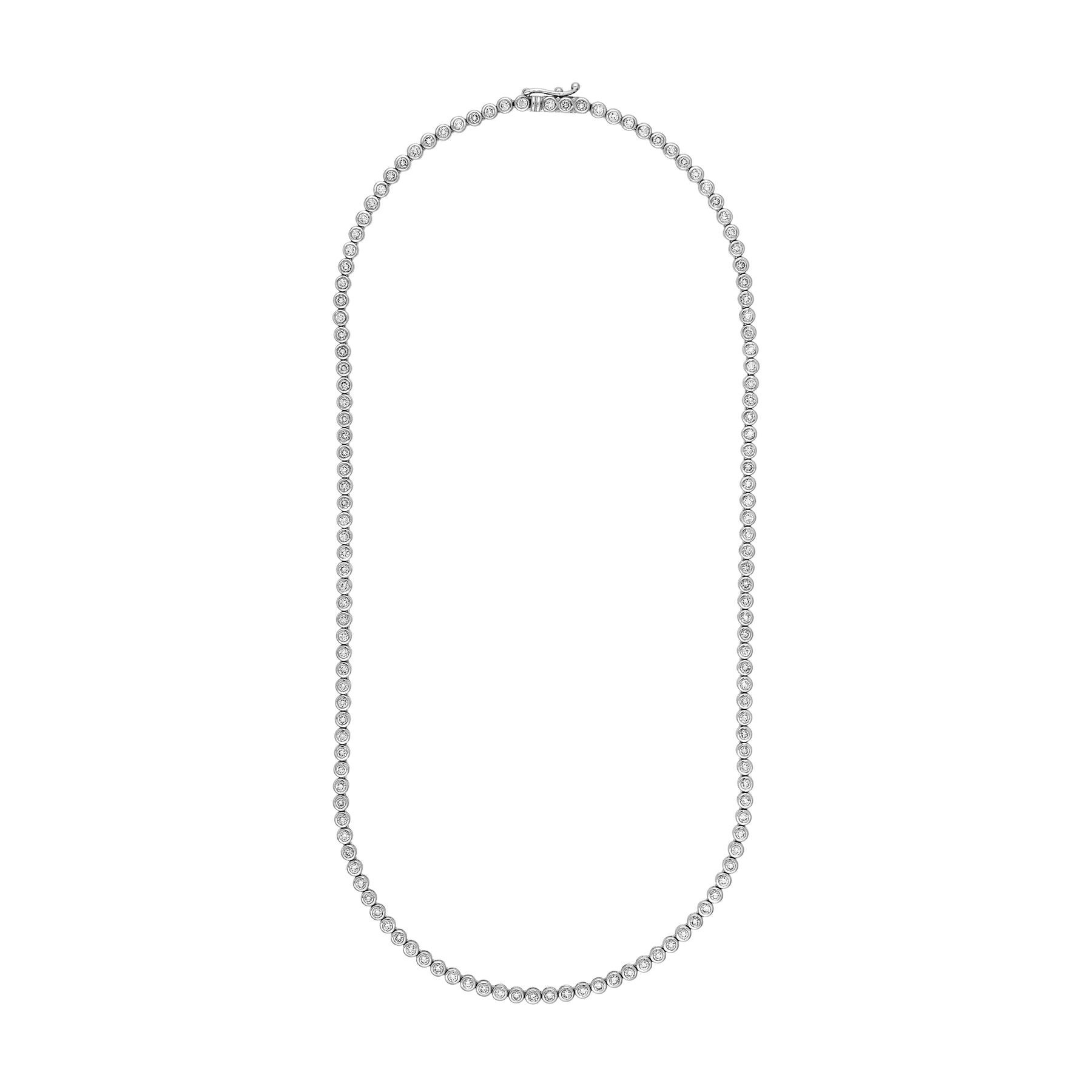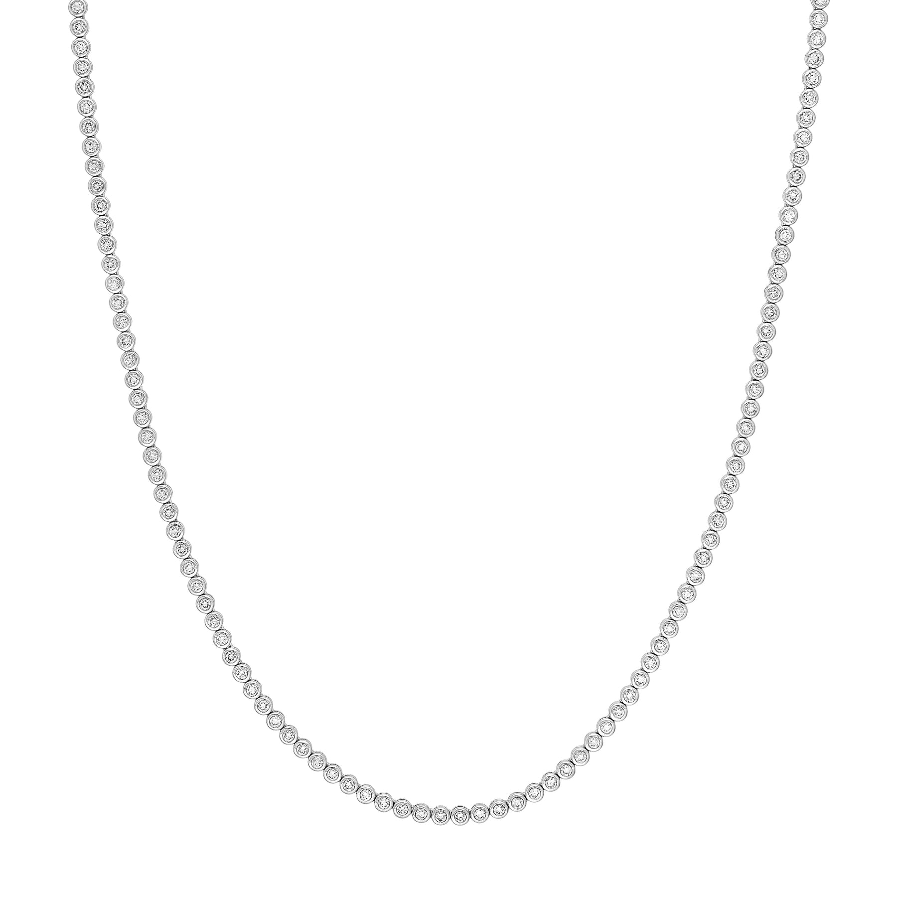 A classic tennis necklace featuring bezel set diamonds—an elegant addition to any collection. This necklace secures with a box lock for a sleek, secure fit.