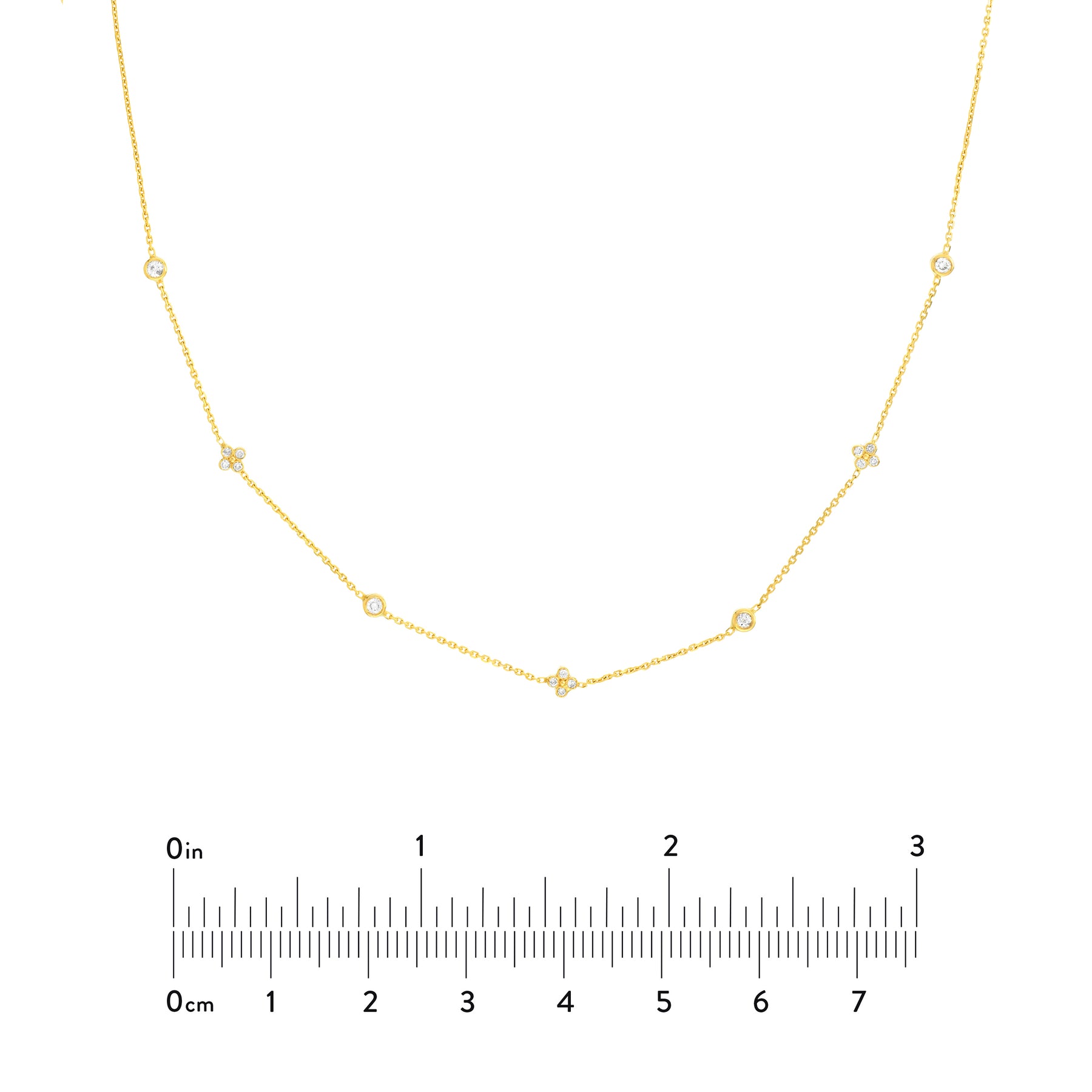 Add some sparkle to your favorite outfit with this diamond bezel and cluster stations necklace. Made of 14K gold, this adjustable necklace features 1/6tcw diamonds.