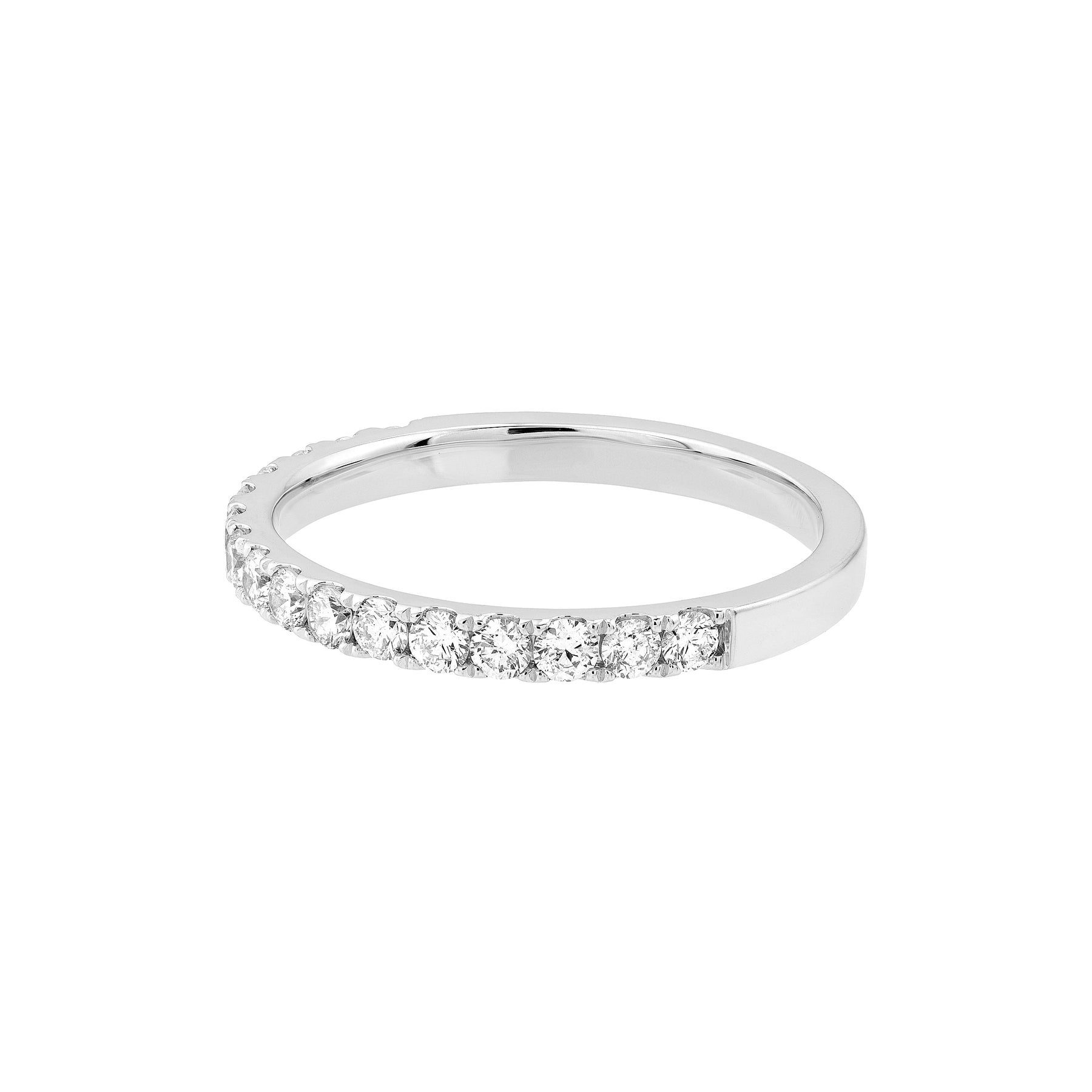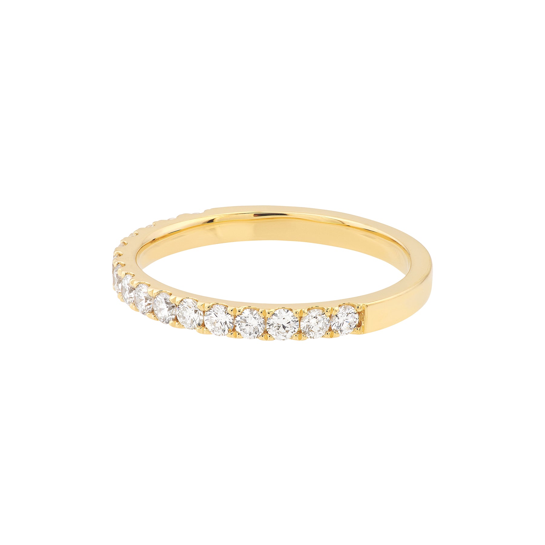 Adorn yourself with diamonds The beautiful 1/2tcw, 2mm diamonds are featured halfway around, adding a vibrant touch to your stack.