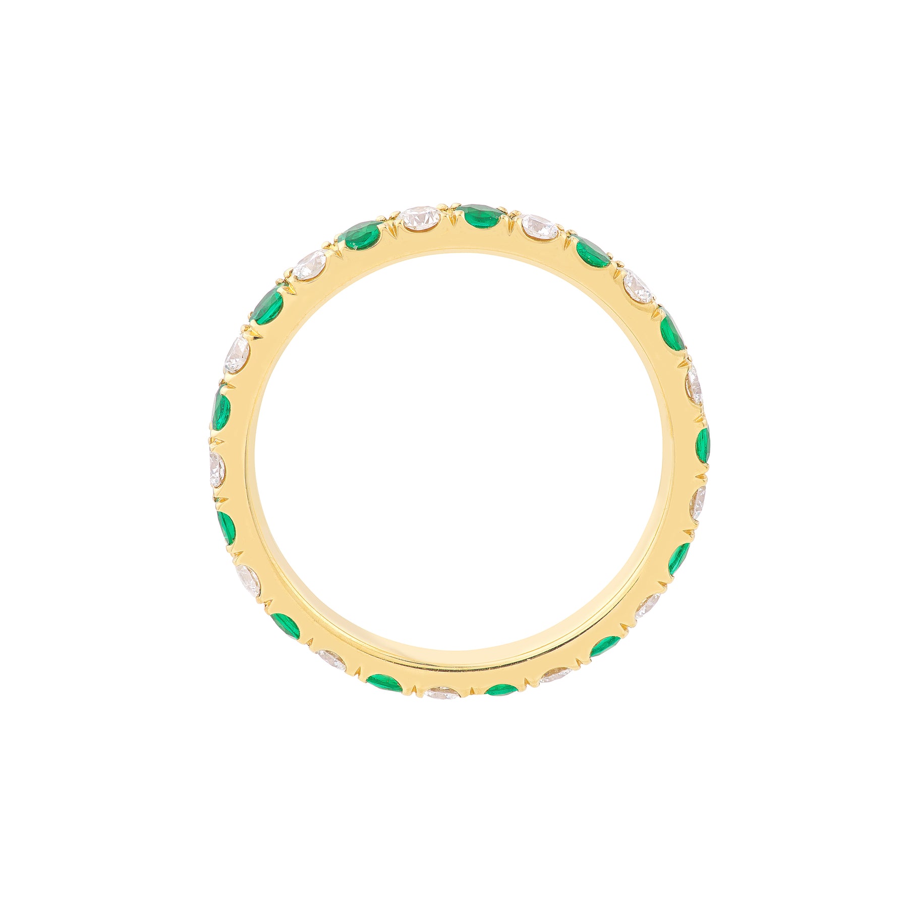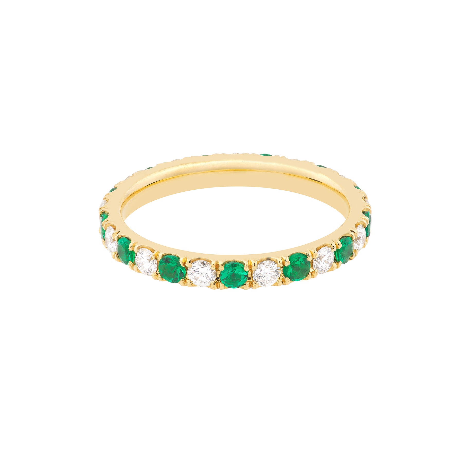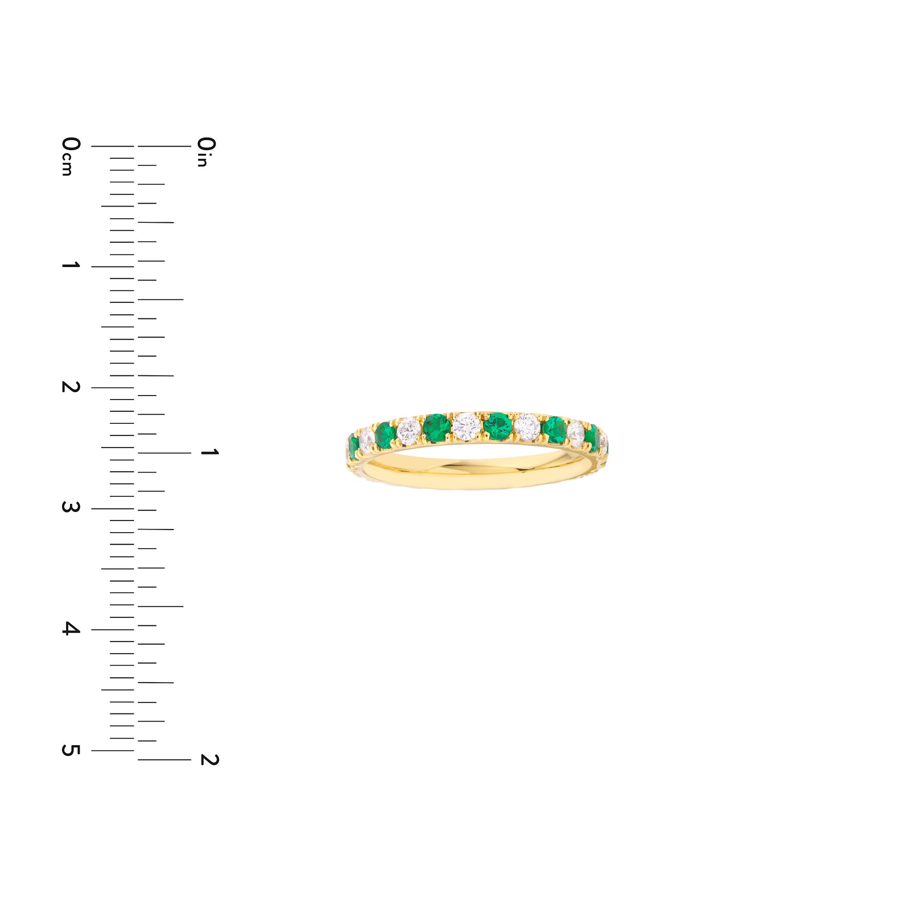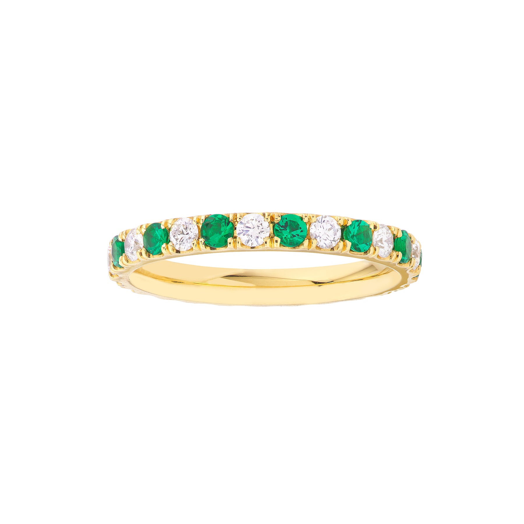 This classic eternity band ring combines timeless elegance with dazzling appeal. Set with 1/2tcw of 2.2mm diamonds and vibrant emeralds, this ring is made-to-order with care.