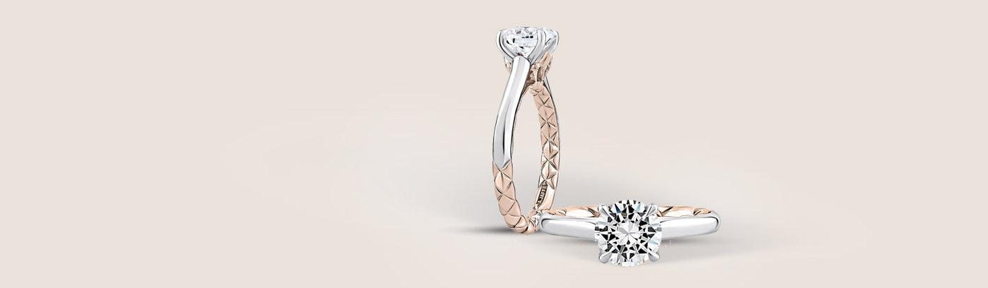 Lyric Solitaire Diamond Engagement Ring with Hidden Diamond Halo and Inner Carved details and Polished Shank